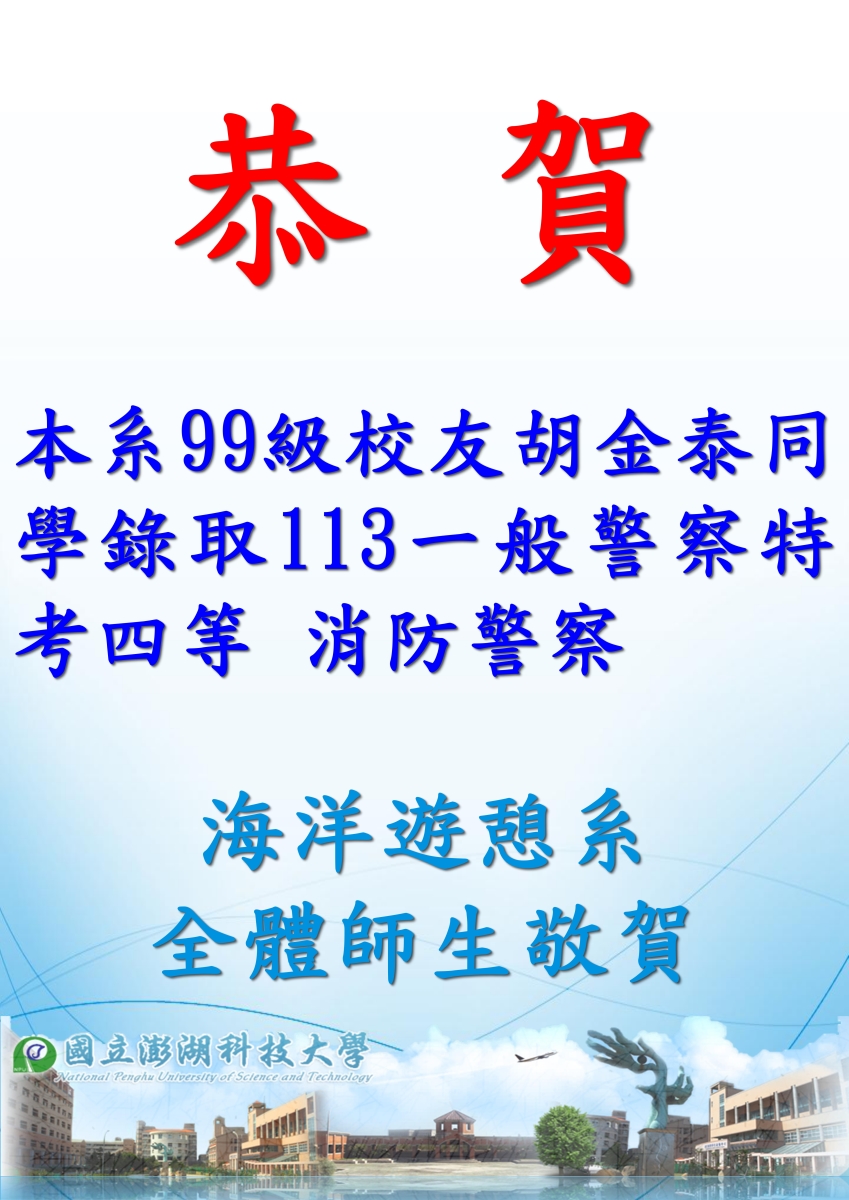 恭賀本系99級校友胡金泰同學錄取113警察特考四等 消防警察