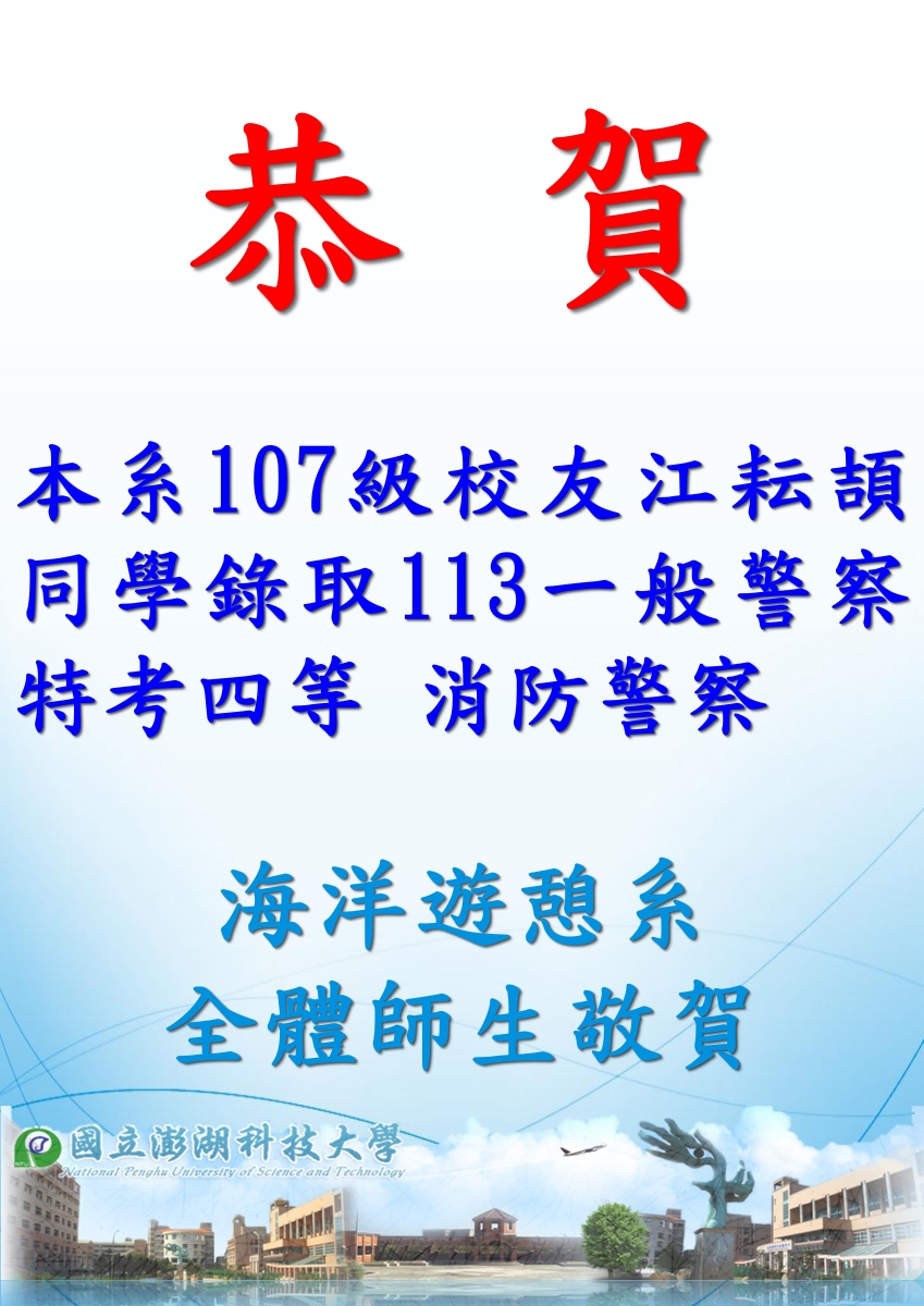 恭賀本系107級校友江耘頡同學錄取113警察特考四等 消防警察